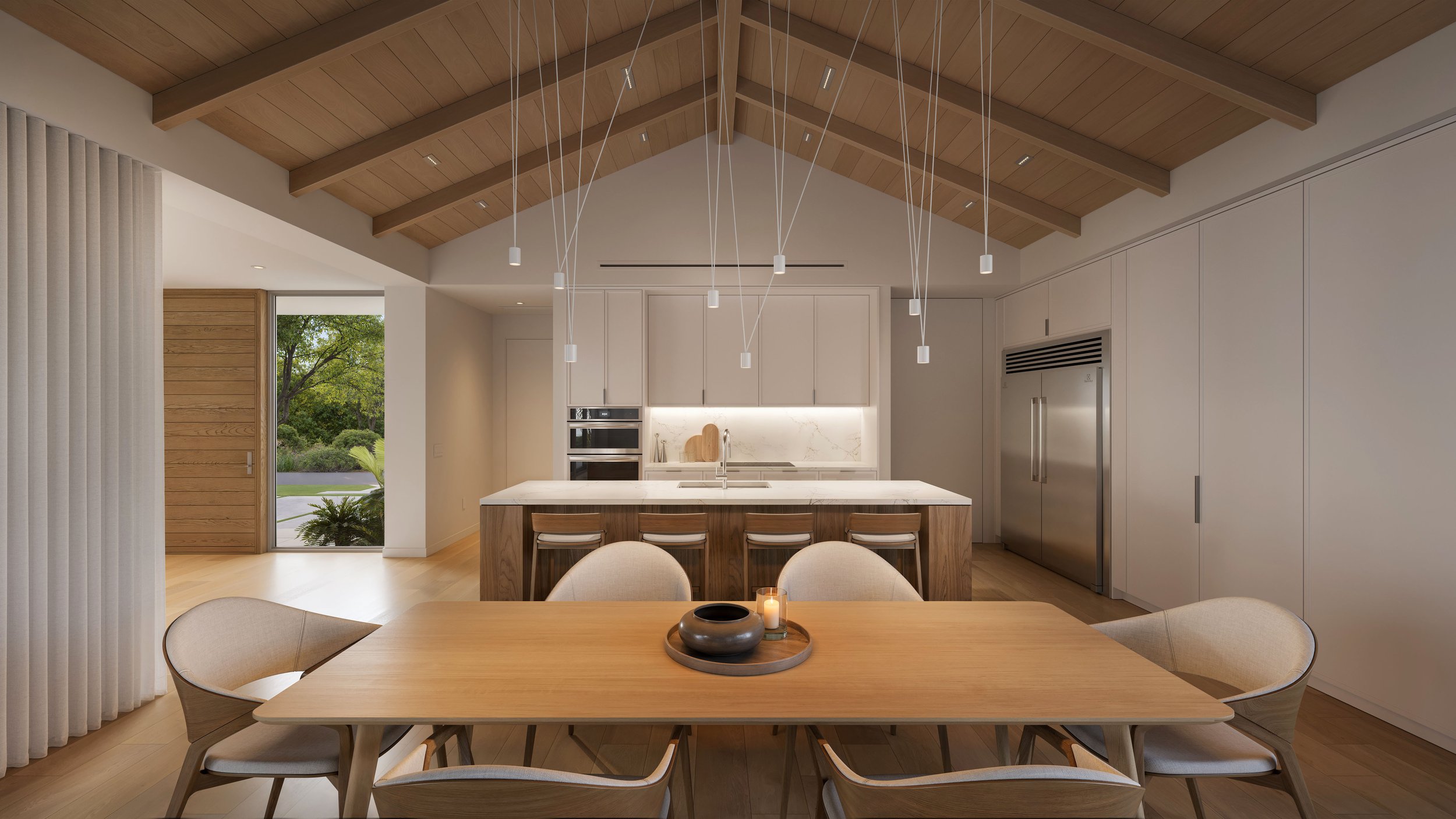 The main entry and covered backyard terrace are recessed into the intersection of the T-shaped volume and reinforced by a break in the sloped gable rooflines above. The material palette of vertical siding, exposed interior beams, wood soffits, and a standing seam metal roof introduces texture and a better sense of scale in contrast to the flat stucco homes typical of the region.