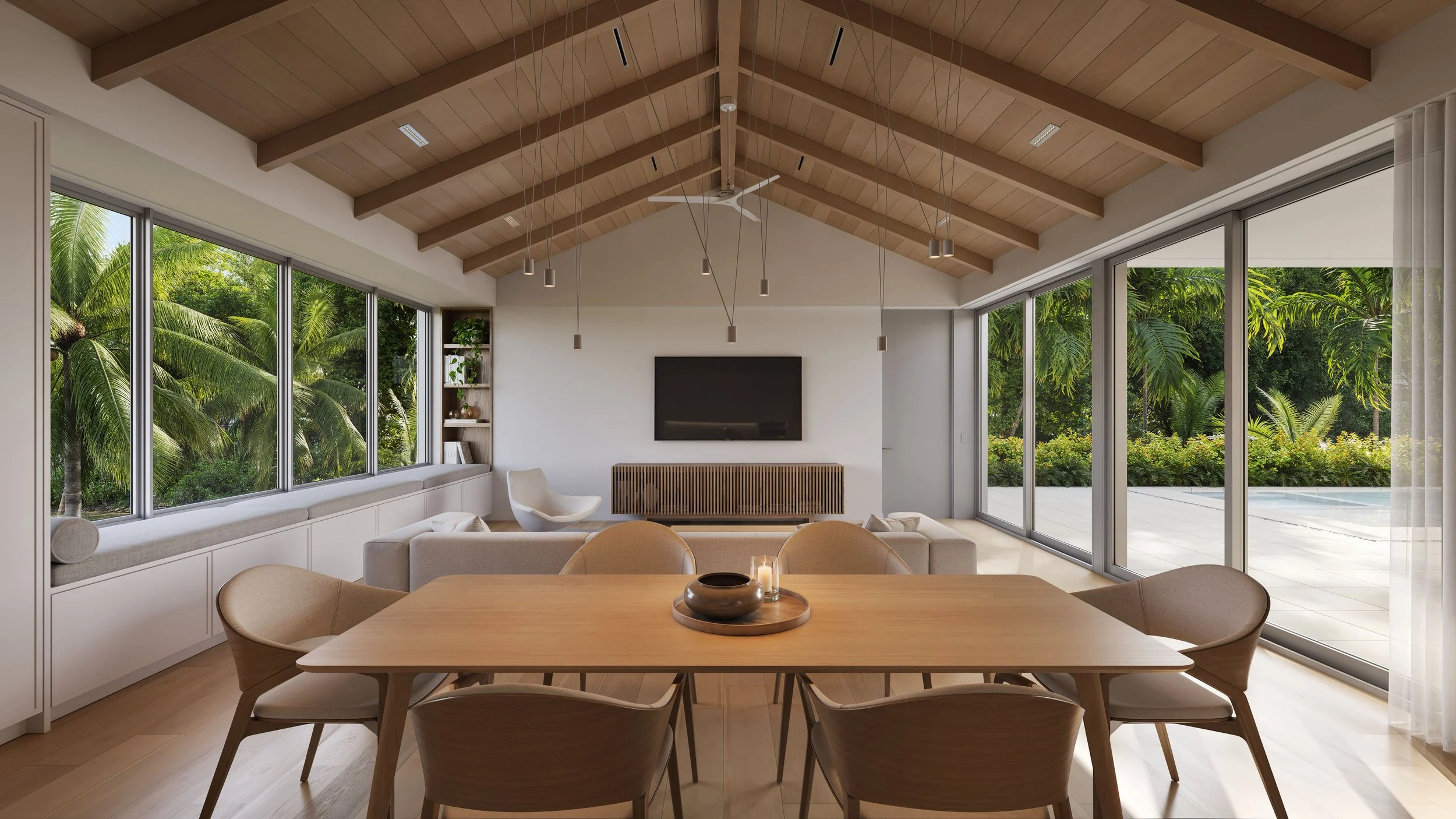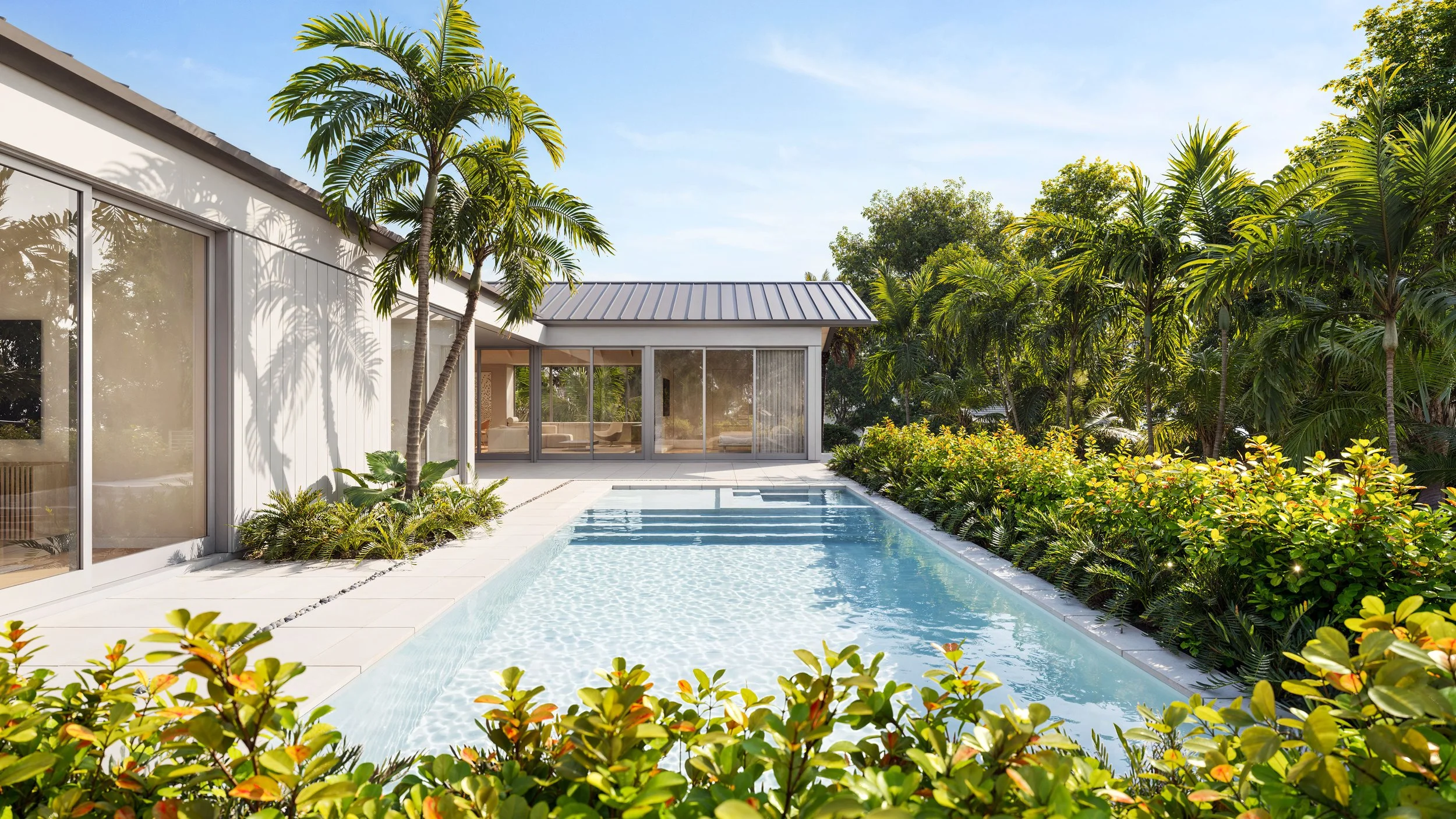 Collaboration with the clients resulted in a design that organizes the house as a T-shaped volume, elevating the home, garage, and pool while carefully shaping the outdoor spaces. A sloped driveway at the northwest corner provides access to the garage, while the southwest corner of the lot was reserved for the elevated pool terrace to maximize sun exposure. Dual primary suites flank this outdoor space, creating a resort-like environment with direct views of the pool from both bedrooms.